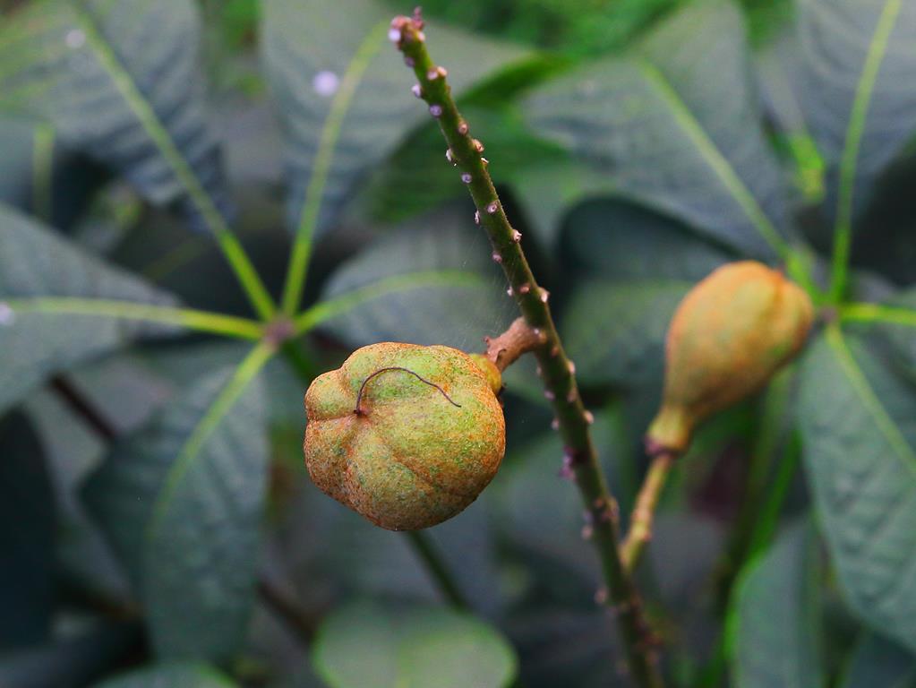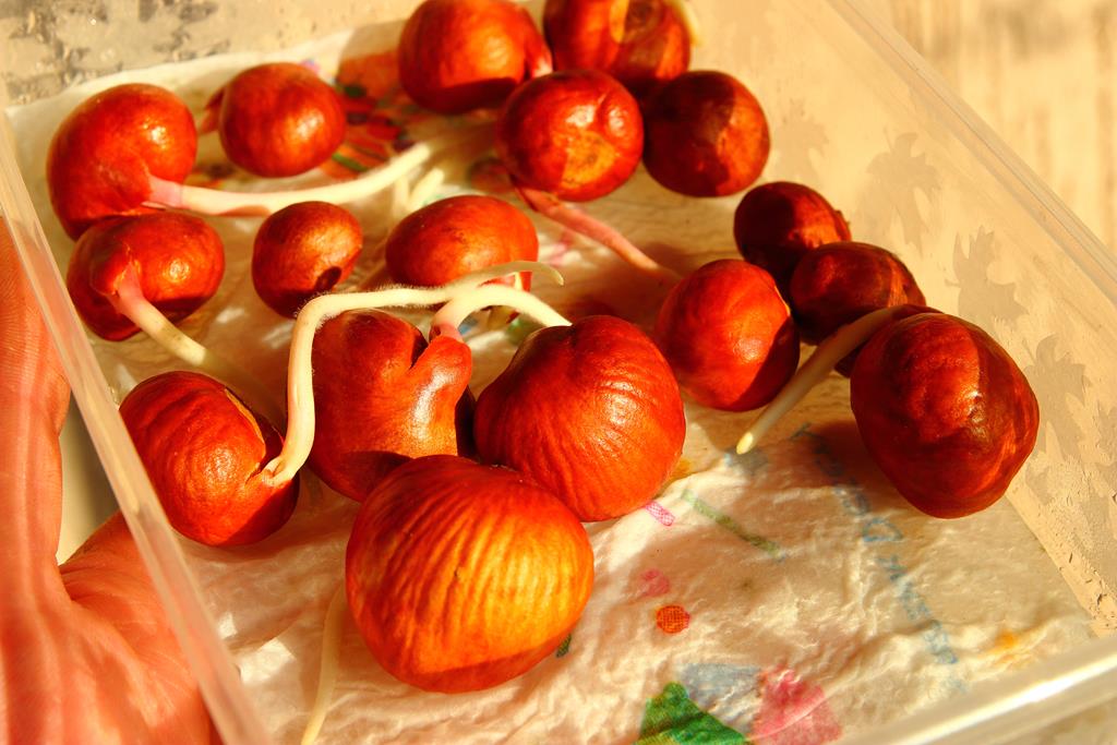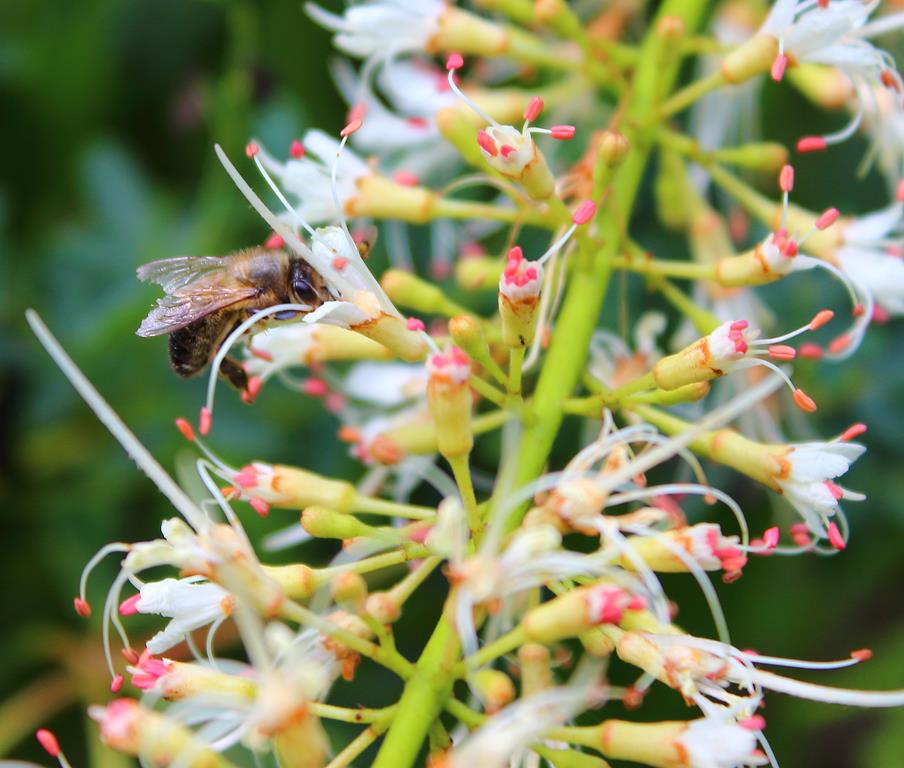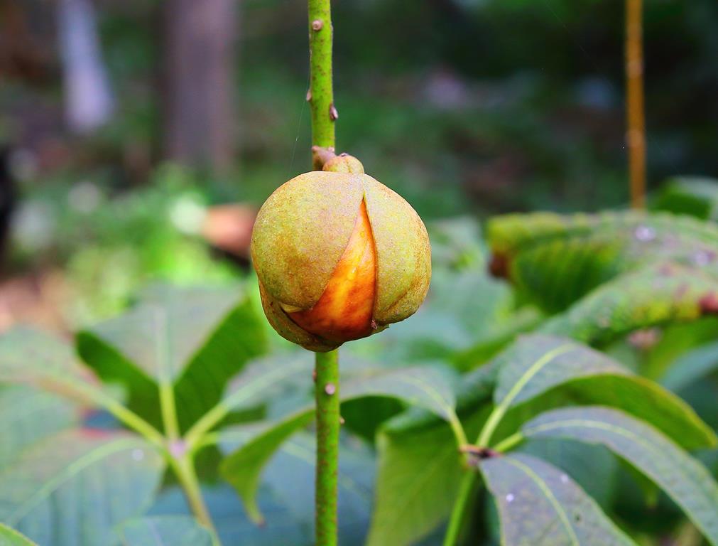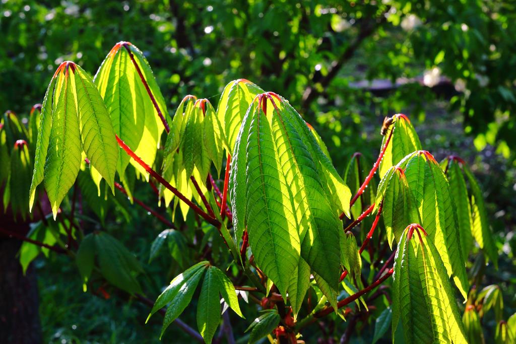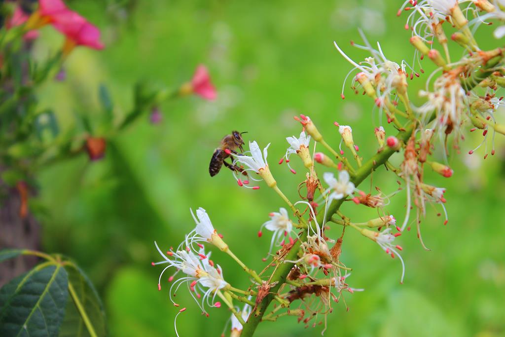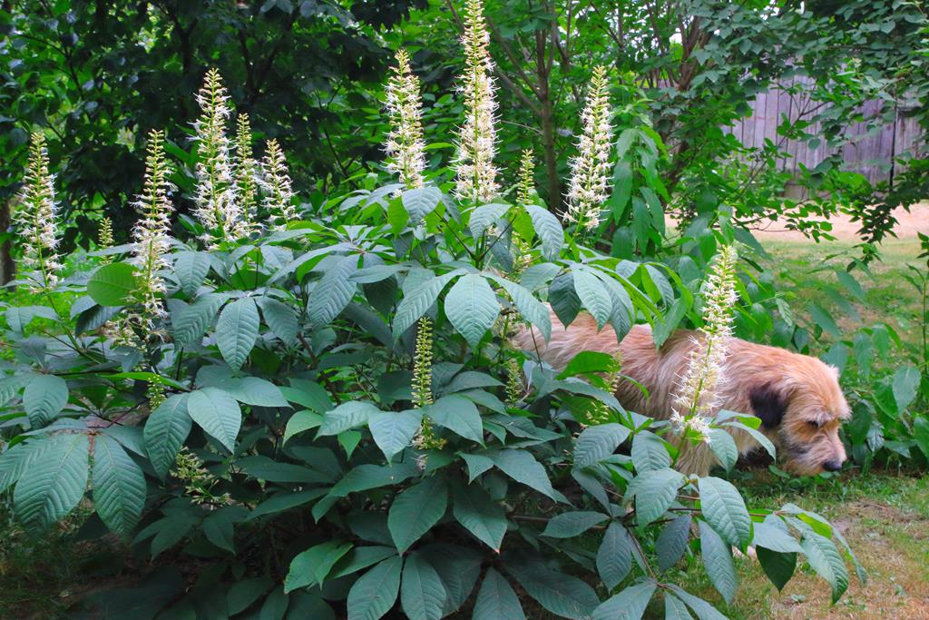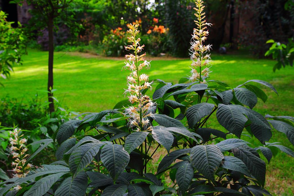 Opis. Rozłożysty, wolno rosnący krzew dorastający do ok. 4 m wysokości. Liście dłoniasto złożone, duże. Kwiaty białe, z wystającymi pręcikami, zebrane w wąskie, wyprostowane kwiatostany. Kwitnie w lipcu. Owoce owalne, brązowe, dojrzewają w październiku.
