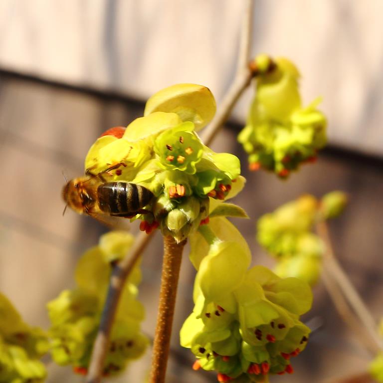 Opis. Krzew dorastający do wysokości 2-3 m. Pokrój nieregularny, szeroki. Liście jajowate, do 10 cm dł, Kwiaty żółte, dzwonkowate, zebrane w niewielkie zwisające kwiatostany. Zakwita pod koniec marca lub na początku kwietnia.