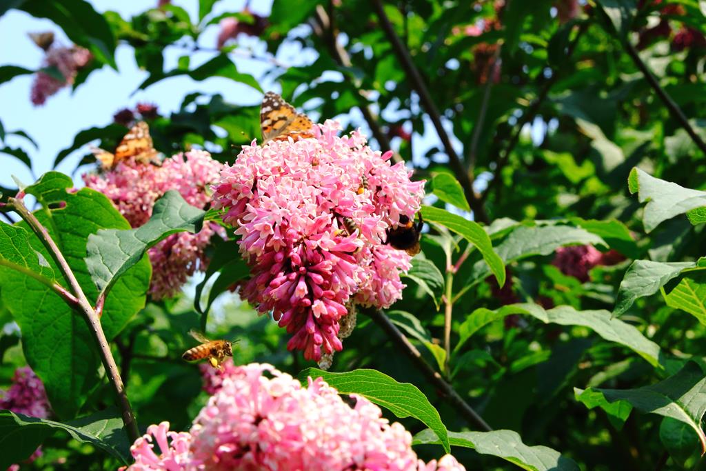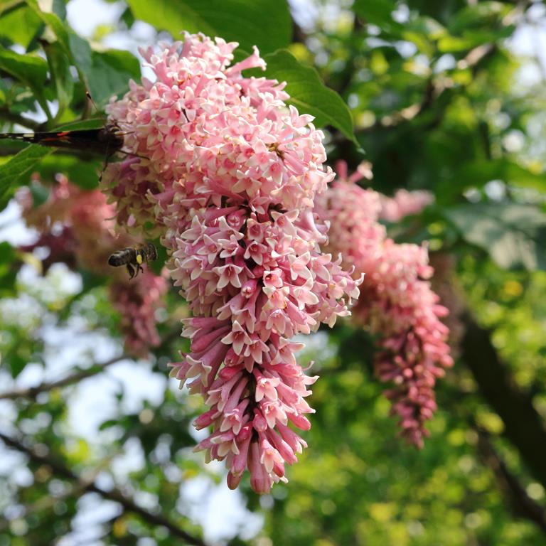 Opis. Krzew dorastający do 4 m wysokości. Pędy sztywne, wyprostowane. Liście ciemnozielone, eliptyczne, do 15-20 cm długości. Kwiaty czerwonoróżowe, zebrane w wąskie, lekko przewisające wiechy. Kwitnie w drugiej połowie maja.