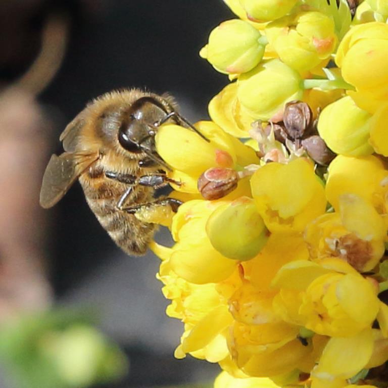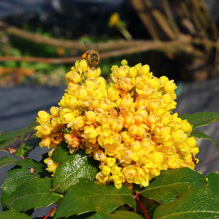 Opis. Zimozielony, niski krzew dorastający do 1,5 m wysokości. Pędy sztywne, gęsto ulistnione. Liście złożone pierzasto, skórzaste i błyszczące. Kwiaty żółte, drobne, zebrane w gęste, wiechowate kwiatostany. Kwitnie w maju. Owoce granatowe, owalne, z jasnoniebieskim woskowym nalotem. Dojrzewają w sierpniu.