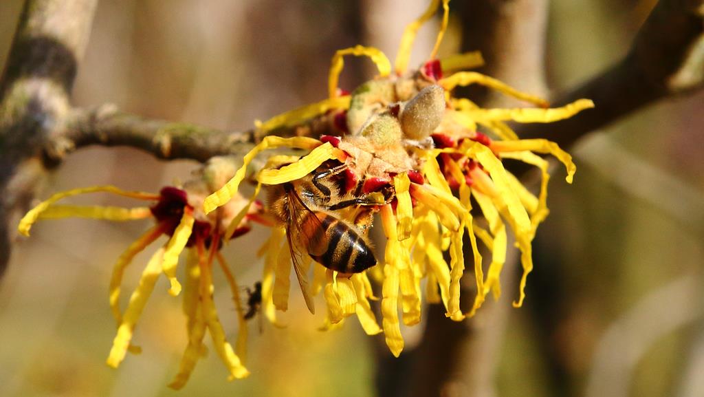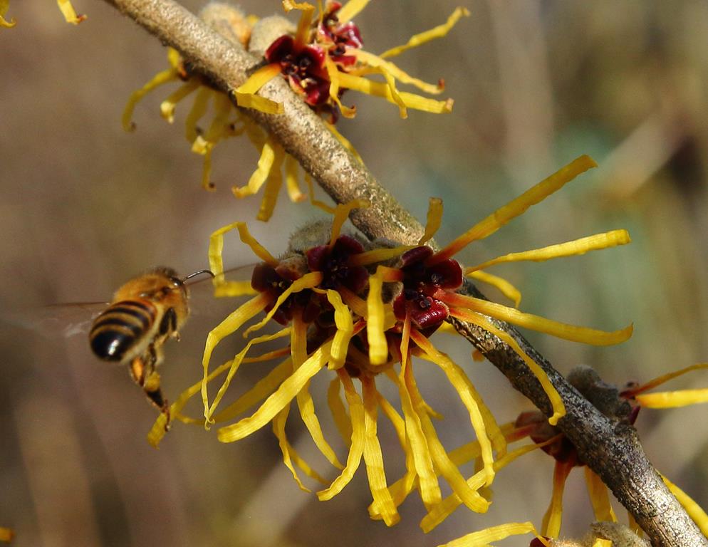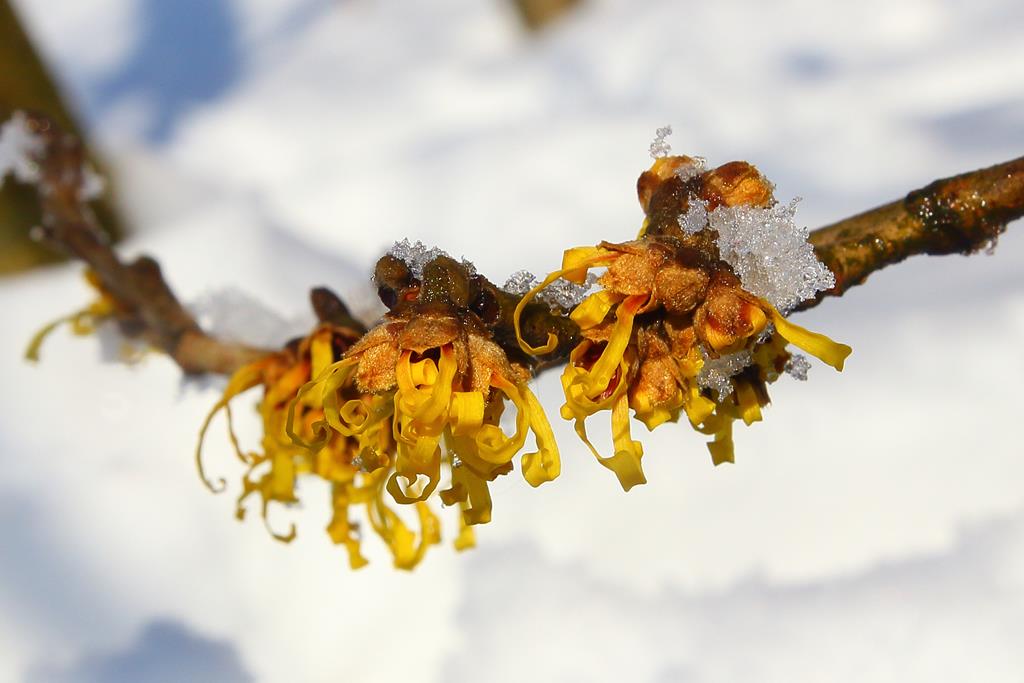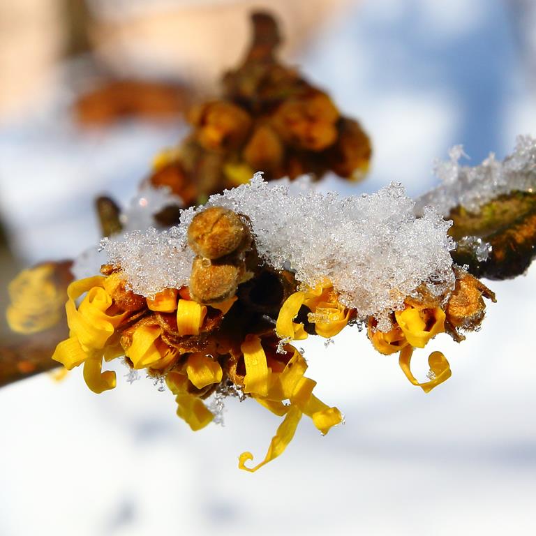 Opis. Wolno rosnący krzew o wysokości do 3-4 m. Pokrój szeroki, odwrotnie stożkowaty. Młode pędy i pąki miękko owłosione. Liście duże, owalne, długości 10-15 cm, jesienią intensywnie żółte. Kwiaty złocistożółte, frędzelkowate, mocno pachnące. Kwitnie obficie styczeń - marzec w czasie odwilży. Owocem są zdrewniałe torebki wypełnione czarnymi nasionami.