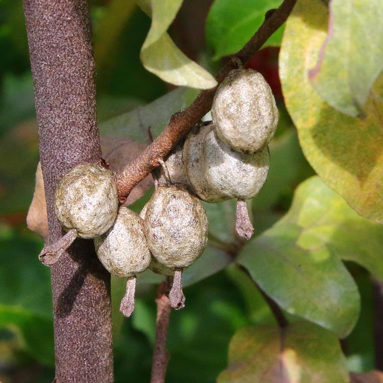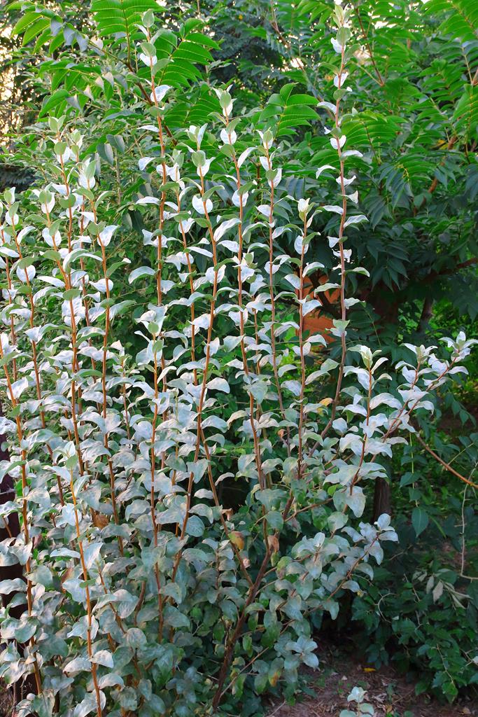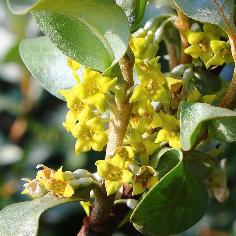 Opis. Krzew o rozłożystym, nieregularnym pokroju, dorastający do 2 m wysokości. Wytwarza odrosty korzeniowe. Liście eliptyczne, srebrzyste. Kwiaty drobne, żółtawe, liczne, zebrane po kila w kątach liści. Kwitnie w drugiej połowie maja przez ok 2-3 tyg. Owoce kuliste, srebrzyste, do 1 cm średnicy. Dojrzewają w sierpniu i wrześniu.