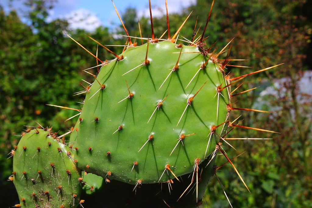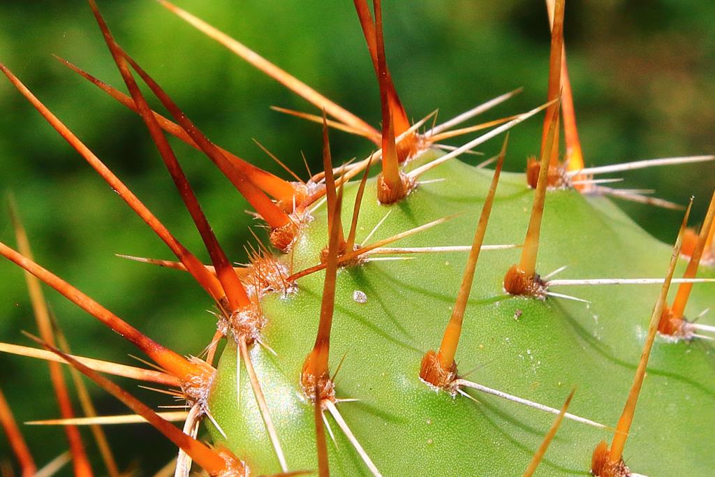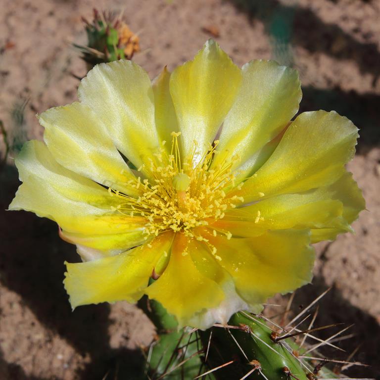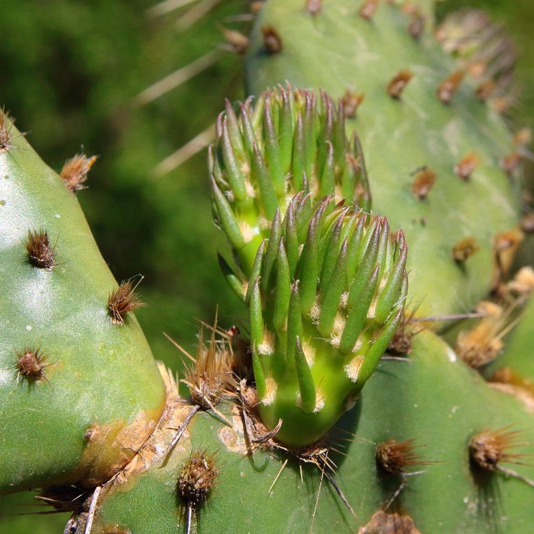 Opis. Zimotrwały kaktus osiągający około 40 cm wysokości i średnicy 150 cm, z pędami częściowo leżącymi na ziemi. Człony pędów owalne, długości 10-20 cm, z bardzo licznymi cierniami. Kwiaty żółte, średnicy do 6 cm, ukazujące się w czerwcu - lipcu. Owoce czerwonawe, beczkowate, 3-5 cm długości, 2-3 cm średnicy.