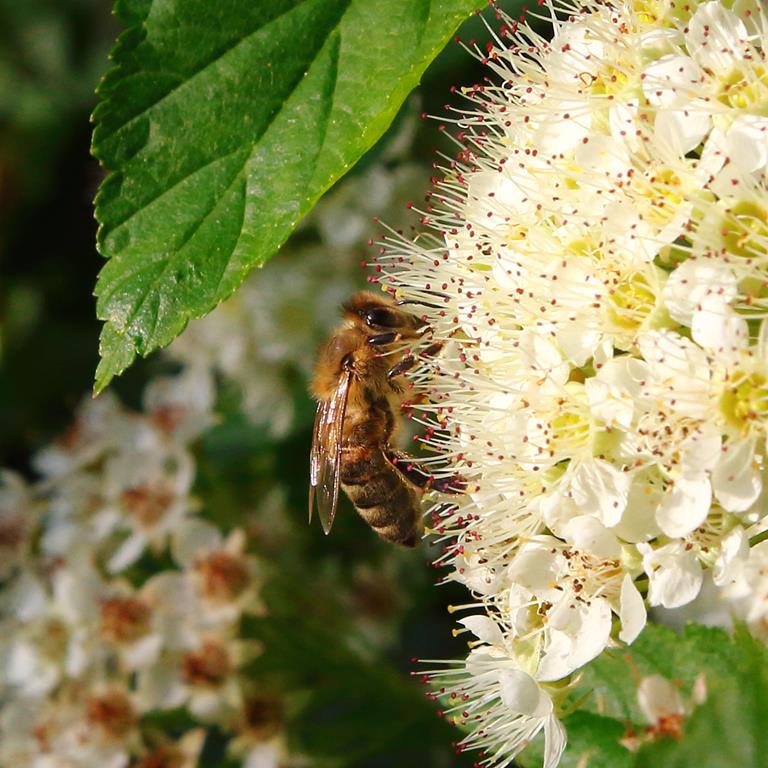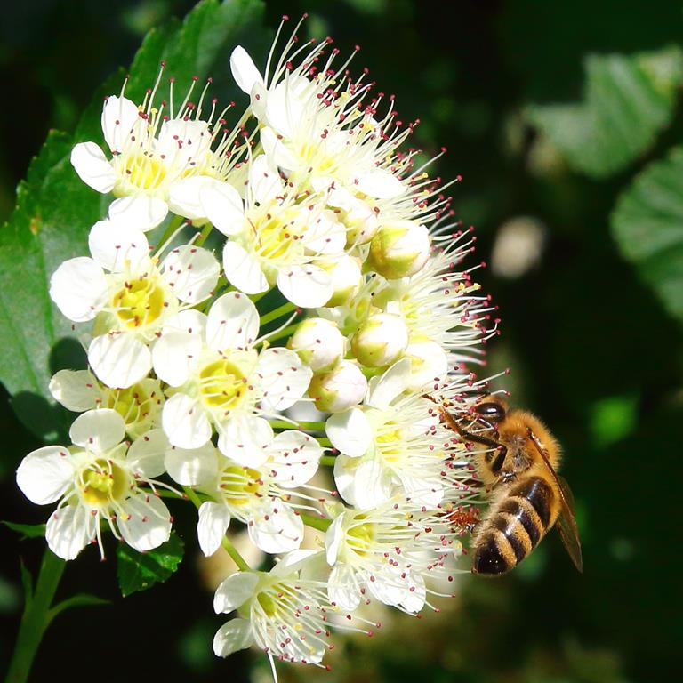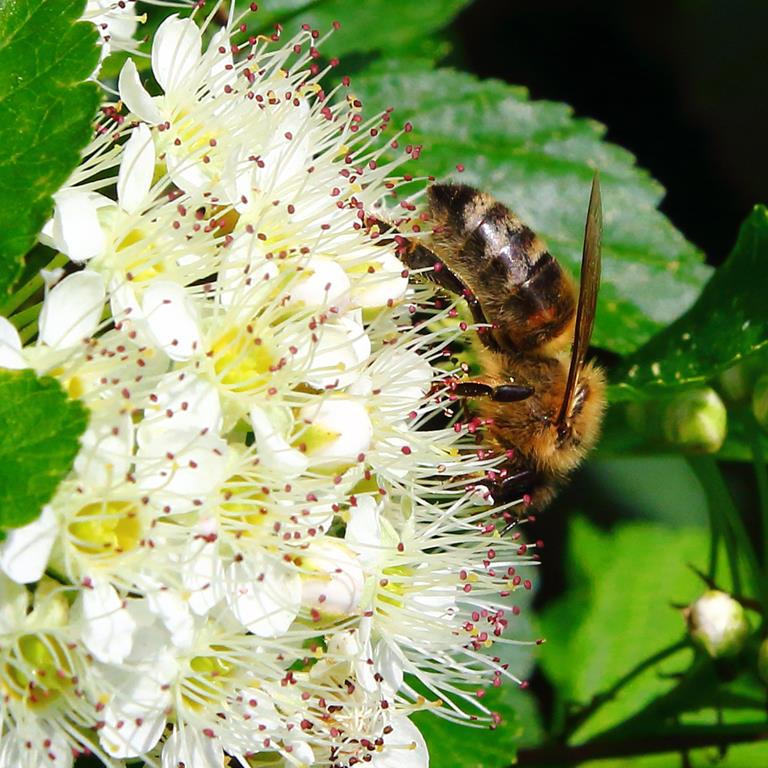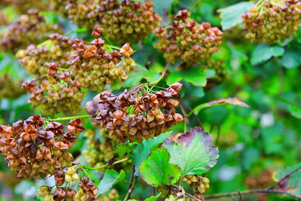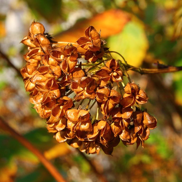 Opis. Rozłożysty, gęsty krzew osiągający 2-3 m wysokości. Kora szara, łuszcząca się podłużnymi płatami. Kwiaty białe, zebrane w kuliste, wypukłe baldachogrona na szczycie krótkich, bocznych gałązek. Kwitnie na przełomie maja i czerwca przez około 2 tygodnie. Owoce drobne, pęcherzykowate, zabarwione na brązowo.