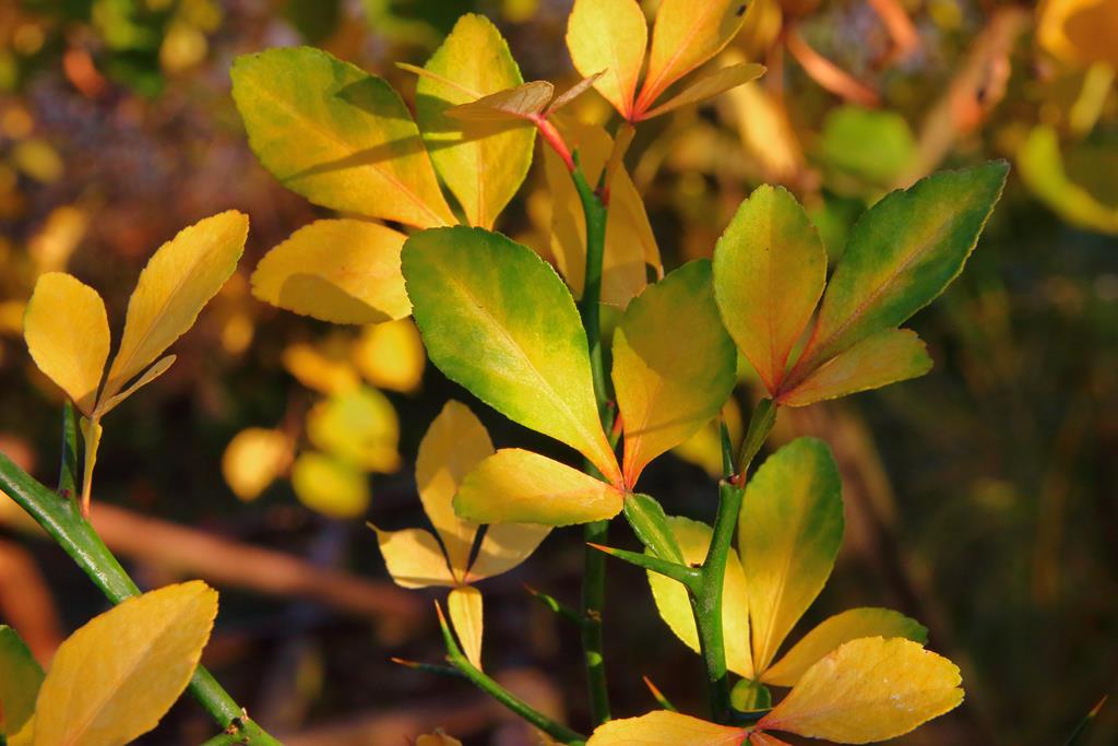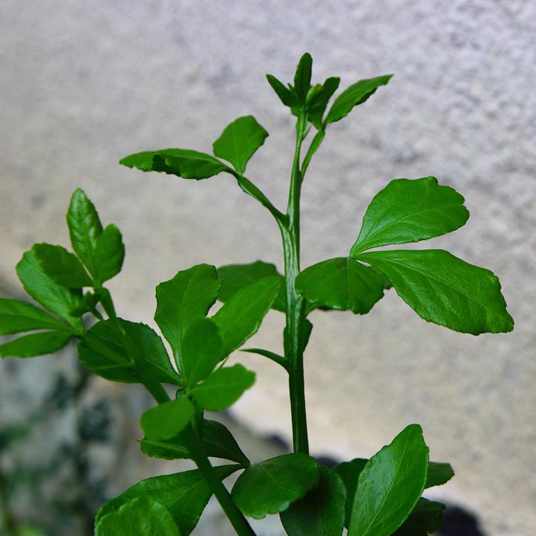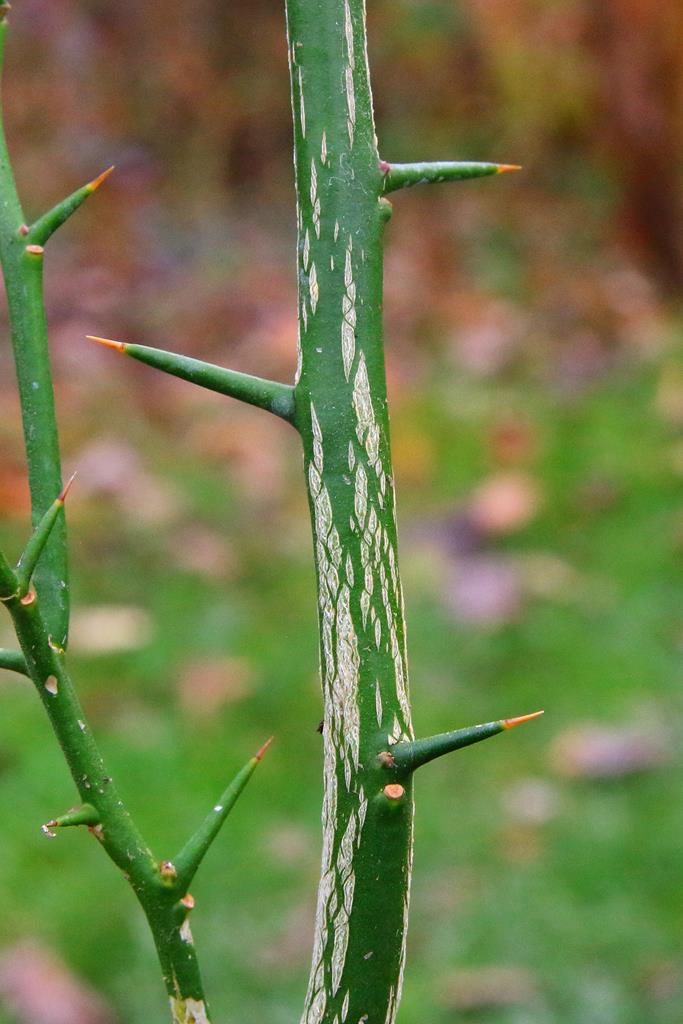 Opis. Krzew dorastający w naszych warunkach do ok. 3 metrów wysokości. Pędy ciemnozielone, spłaszczone, cierniste. Liście zielone, sezonowe, złożone z trzech owalnych listków. Kwiaty małe, białe, pięciopłatkowe, lekko pachnące. Kwitnie w kwietniu i maju. Owoce nieduże, kuliste, żółte, kwaśne, dojrzewają jesienią.