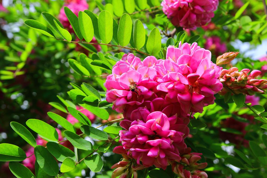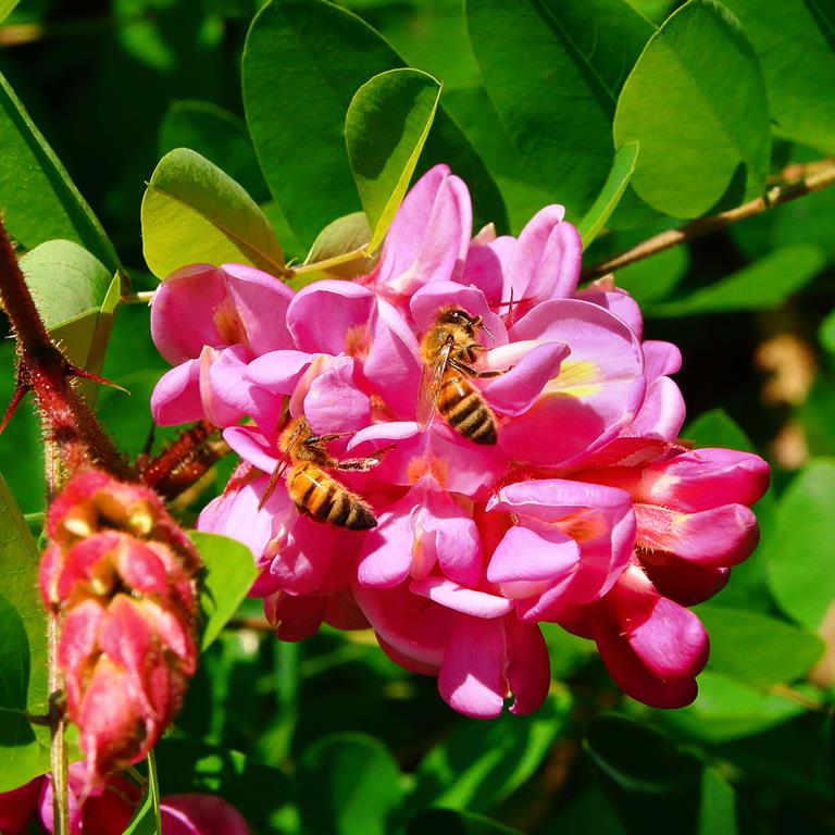Opis. Niewielkie, cierniste drzewo o kulistej, gęstej koronie dorastające do 12 m wysokości. Liście pierzaste, złożone z kilkunastu eliptycznych listków. Kwiaty różowe, zebrane w krótkie, gęste, zwisające kwiatostany. Zakwita w drugiej połowie maja i kwitnie do końca lata. Najmłodsze pędy, osie kwiatostanowe oraz strąki pokryte gruczołkowatymi, lepkimi włoskami.