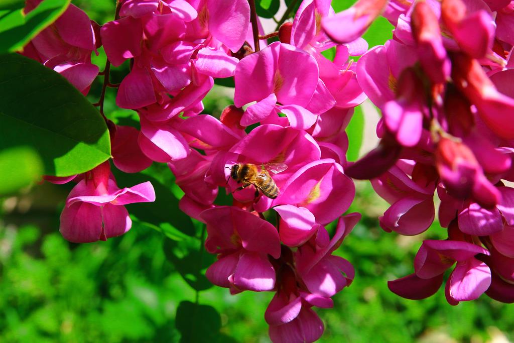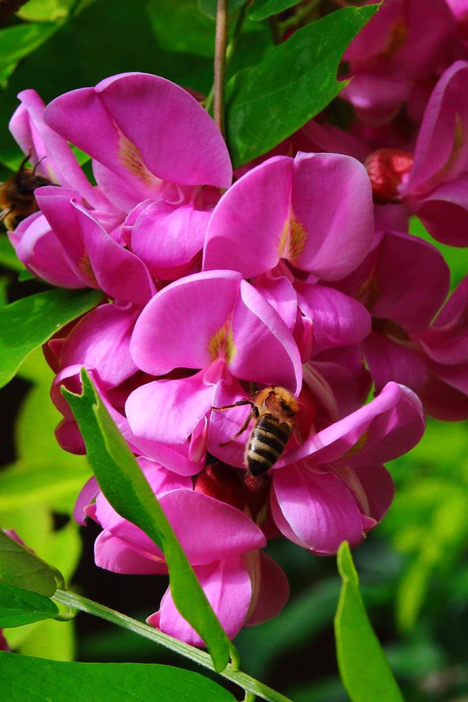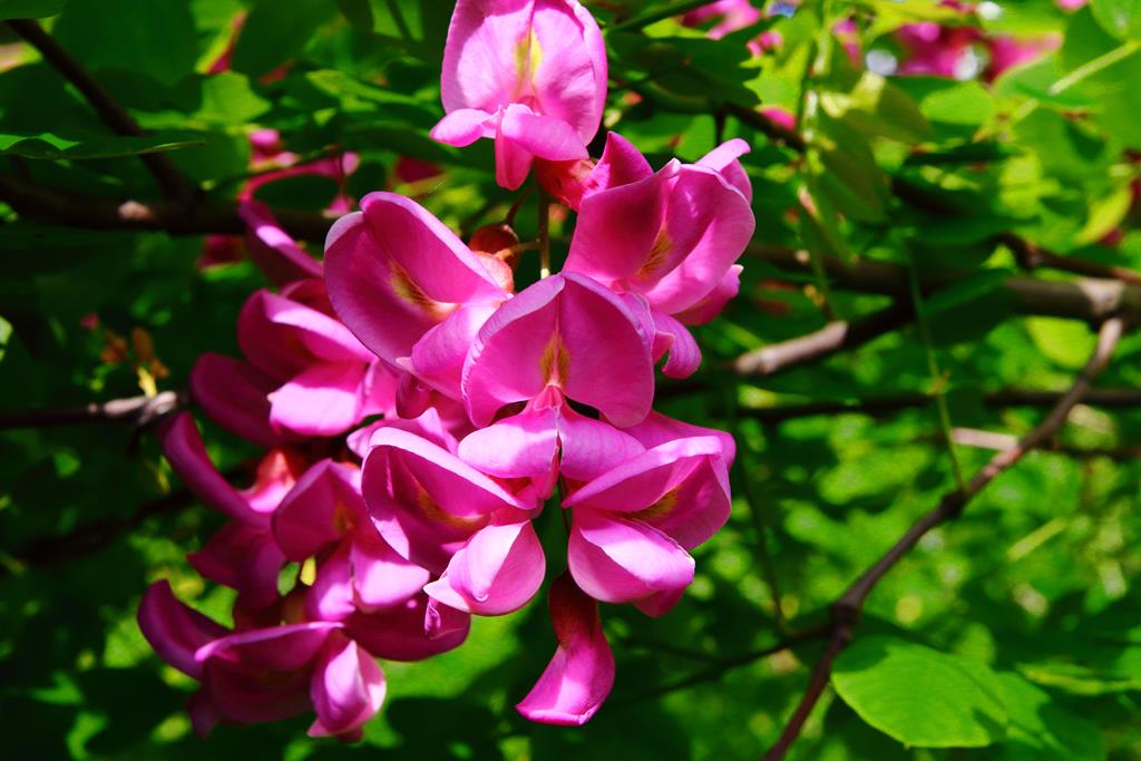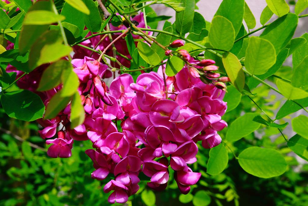 Opis. Drzewo o wysokości 9-15 m. Korona luźna, szeroka, pędy wyprostowane, z małą ilością cierni. Liście pierzaste, złożone z eliptycznych, jasnozielonych listków. Kwiaty ciemnoróżowe, motylkowate, zebrane w liczne, zwisające grona. Kwitnie bardzo obficie na przełomie maja i czerwca.