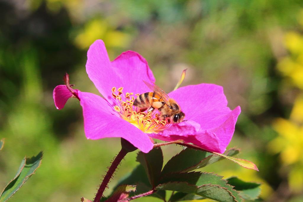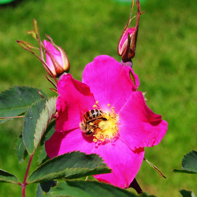 Kwiaty: ciemnoróżowe, pojedyncze, słabo pachnące, średnicy ok. 5 cm, VI