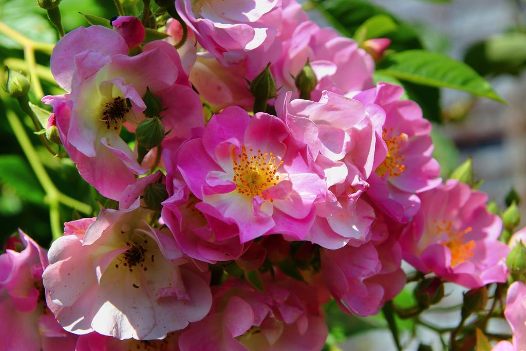 Kwiaty: różowe z białym środkiem, pojedyncze, średniej wielkości, zebrane w duże kwiatostany, VI-VII