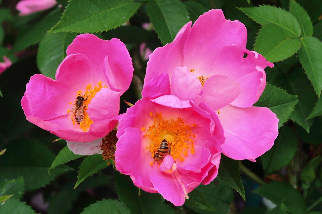 Kwiaty: intensywnie różowe z białym dnem kwiatowym, pachnące, średnicy około 12 cm, VI