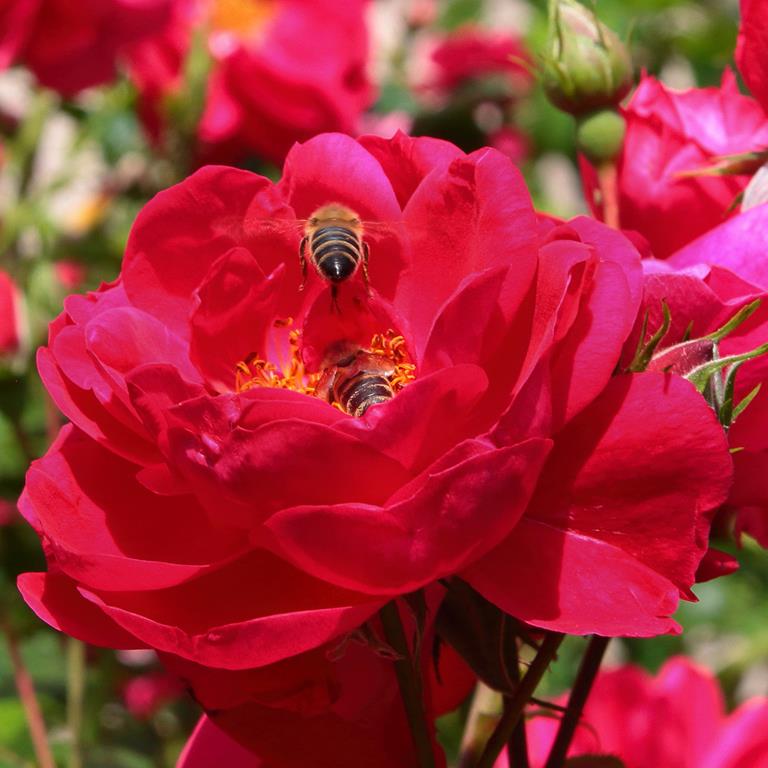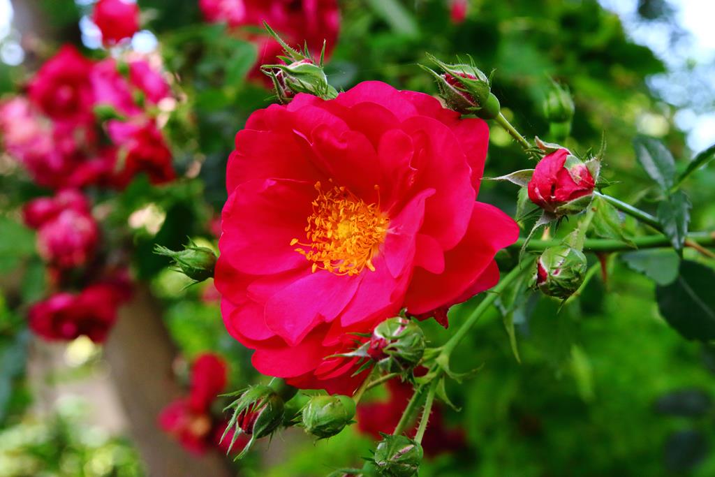 Kwiaty: karminowoczerwone, półpełne, średniej wielkości, zebrane w duże grona, VI-IX