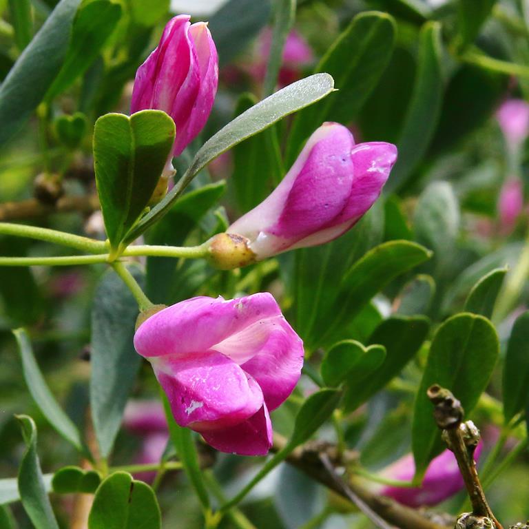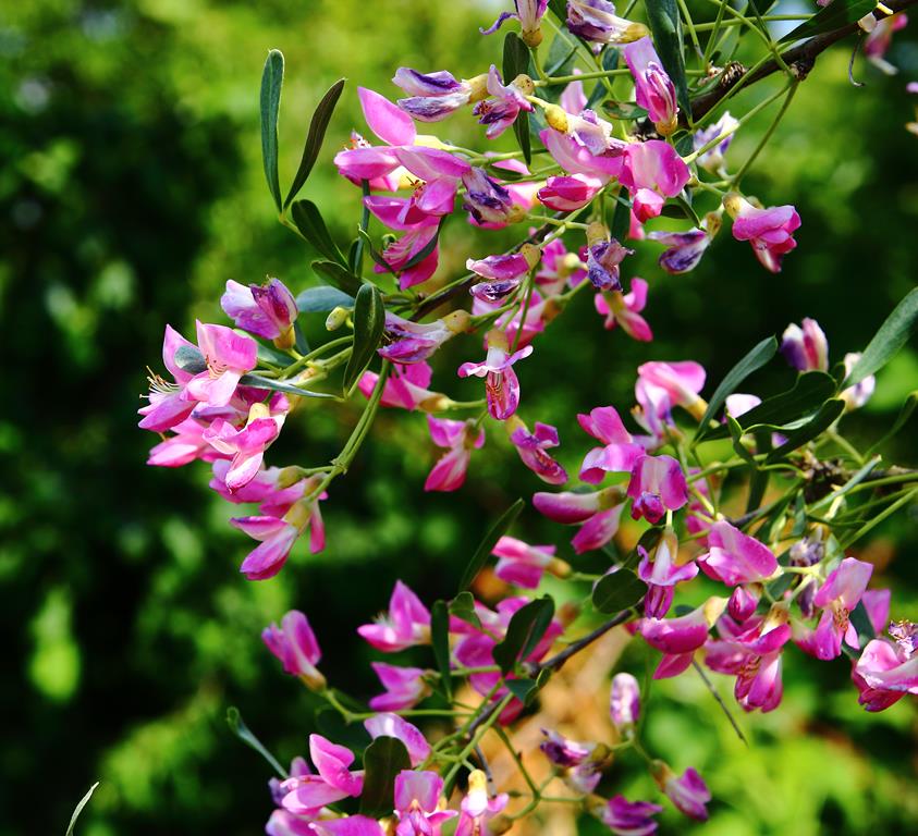 Opis. Krzew o szerokim, luźnym pokroju, dorastający do 2 m wys. Liście szarozielone, lancetowate. Kwiaty motylkowate, różowe lub jasnofioletowe, zebrane niewielkie grona. Kwitnie w końcu maja i na początku czerwca.