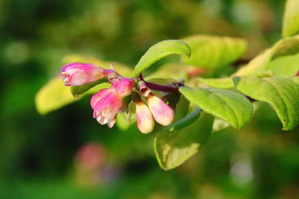 Opis. Niski, szeroki krzew dorastający do 0,5 m wysokości. Liście jajowate, drobne, intensywnie żółte przez cały sezon. Kwiaty niepozorne, białoróżowe, dzwonkowate. Kwitnie od maja do lipca. Owoce różowe z czerwonym rumieńcem.