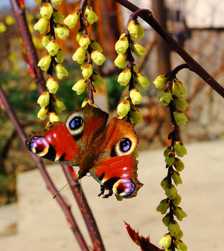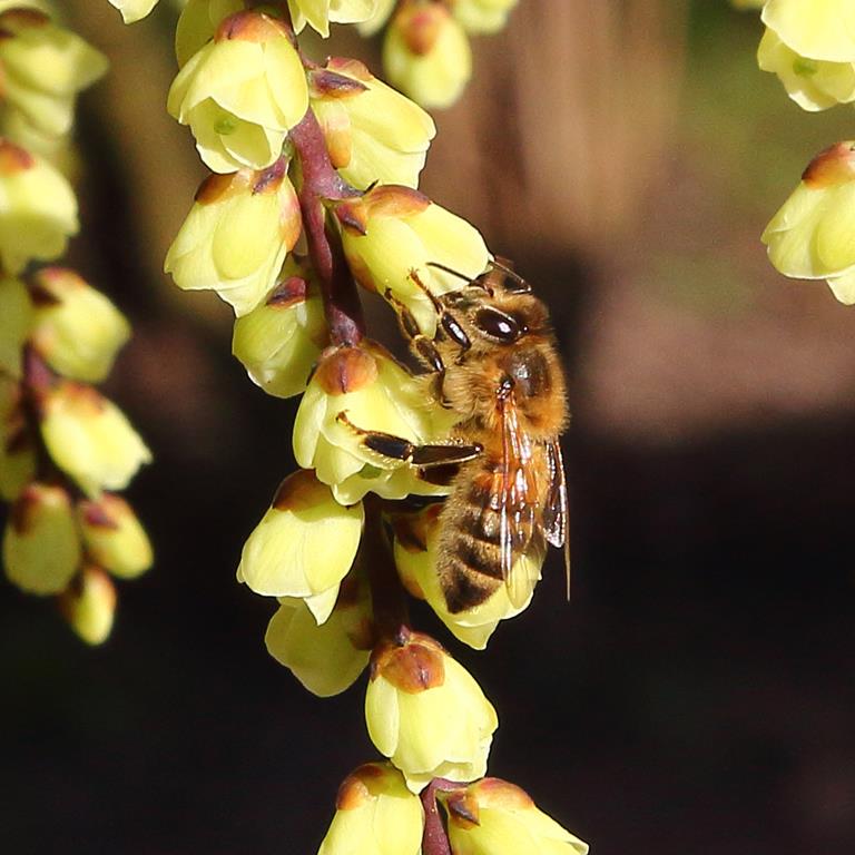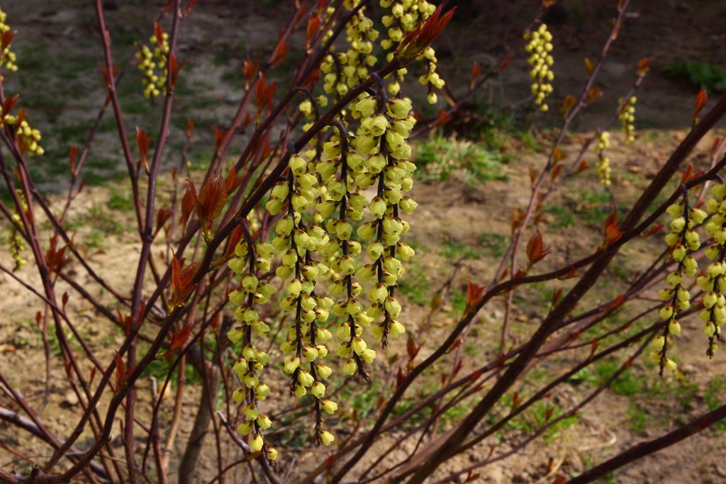 Opis. Krzew wysokości do 3 m i szerokości do 2-3 m. Pędy, czerwonobrązowe, gładkie, błyszczące, pokrój wzniesiony. Liście owalne, ząbkowane, jesienią czerwone. Kwiaty zielonkawożółte, dzwonkowate, zebrane w zwisające grona długości do 12 cm. Kwitnie bardzo obficie na przełomie marca i kwietnia.