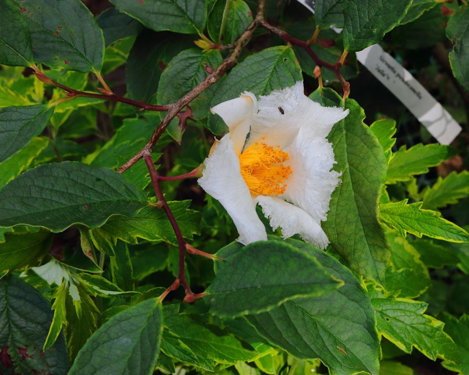 Opis. Krzew dorastający do wysokości 4 m. Liście ciemnozielone, eliptyczne lub jajowate, długości do 9 cm. Kwiaty białe z żółto-pomarańczowymi pylnikami, miseczkowate, średnicy do 7 cm. Zakwita w połowie czerwca i kwitnie przez około 6 tygodni.