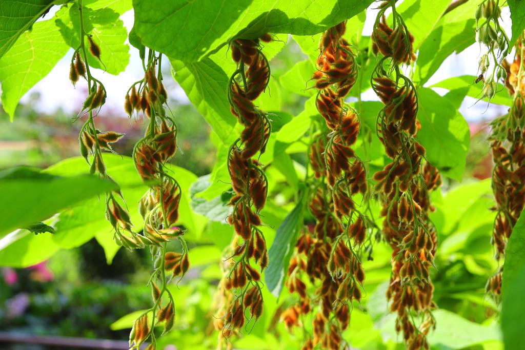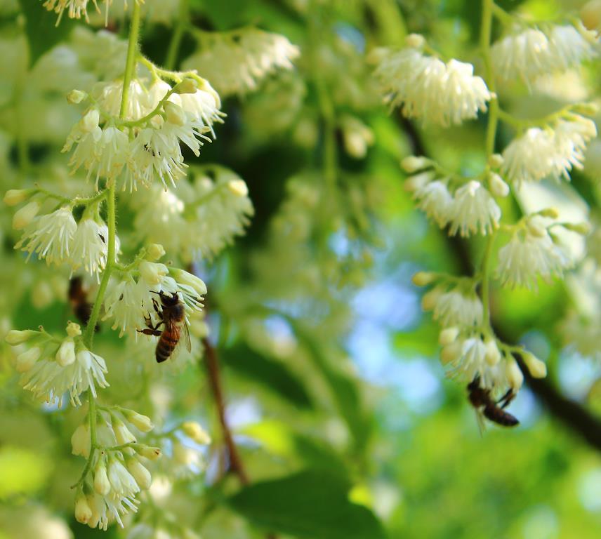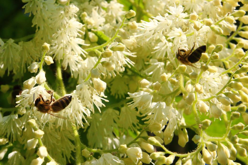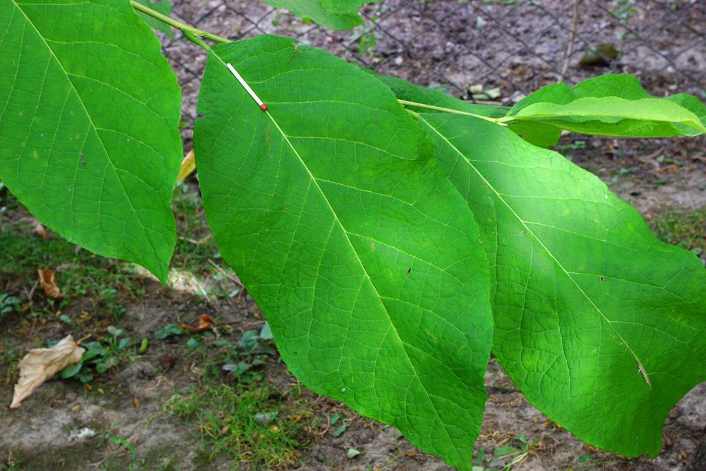 Opis. Wysoki, rozłożysty krzew lub nieduże drzewko do 5 metrów wysokości. Liście owalne, duże, długości do 30 cm. Kwiaty białe, z długimi licznymi pręcikami, zebrane w długie, zwisające wiechy. Kwitnie bardzo obficie w pierwszej połowie czerwca.