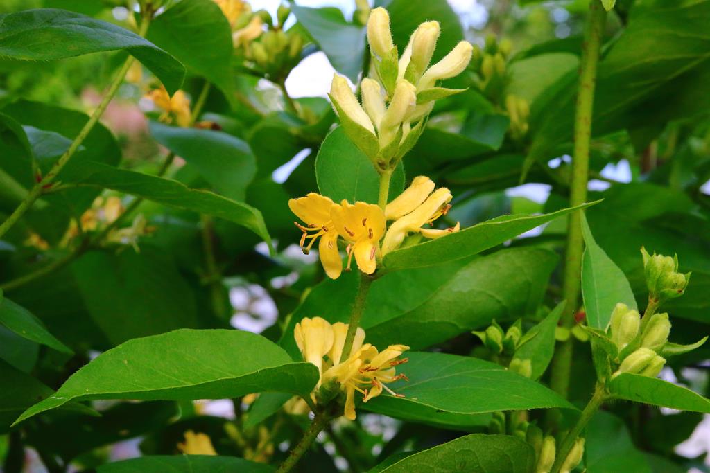 Opis. Krzew o wysokości do 2,5 m. Pokrój początkowo kulisty, później nieregularny. Liście ciemnozielone, szeroko lancetowate. Kwiaty żółte, rurkowate, zebrane w niewielkie kwiatostany na szczytach pędów. Kwitnie na przełomie maja i czerwca. Owoce owalne, czerwone, bardzo dekoracyjne.