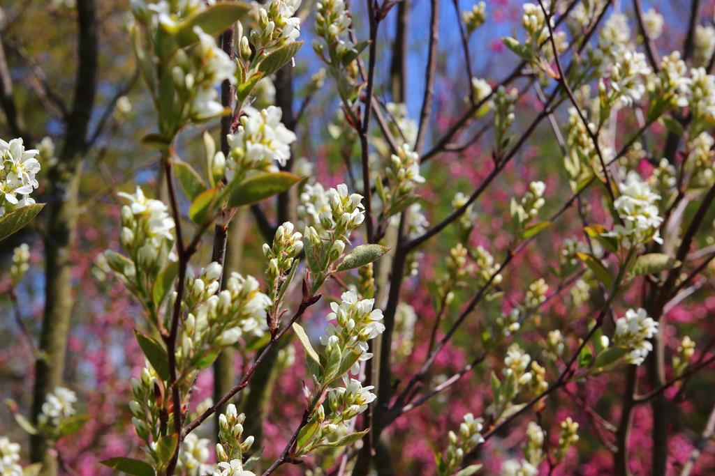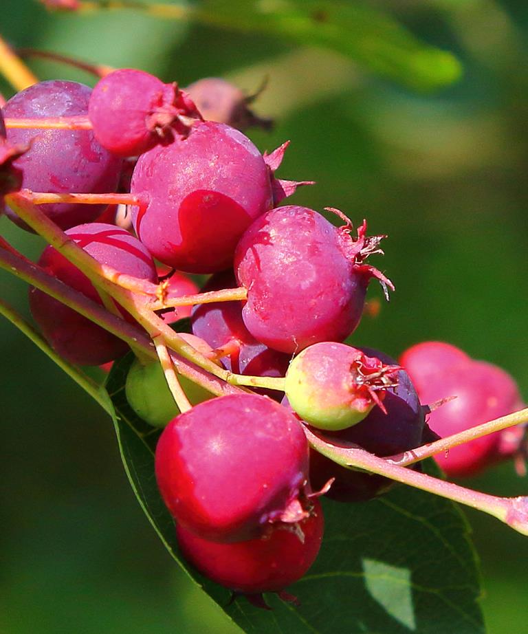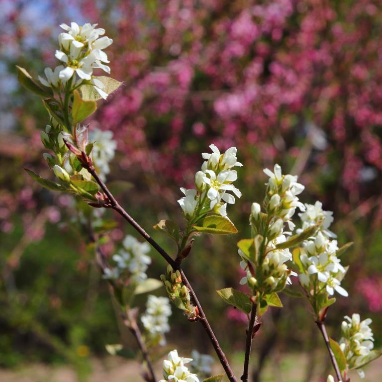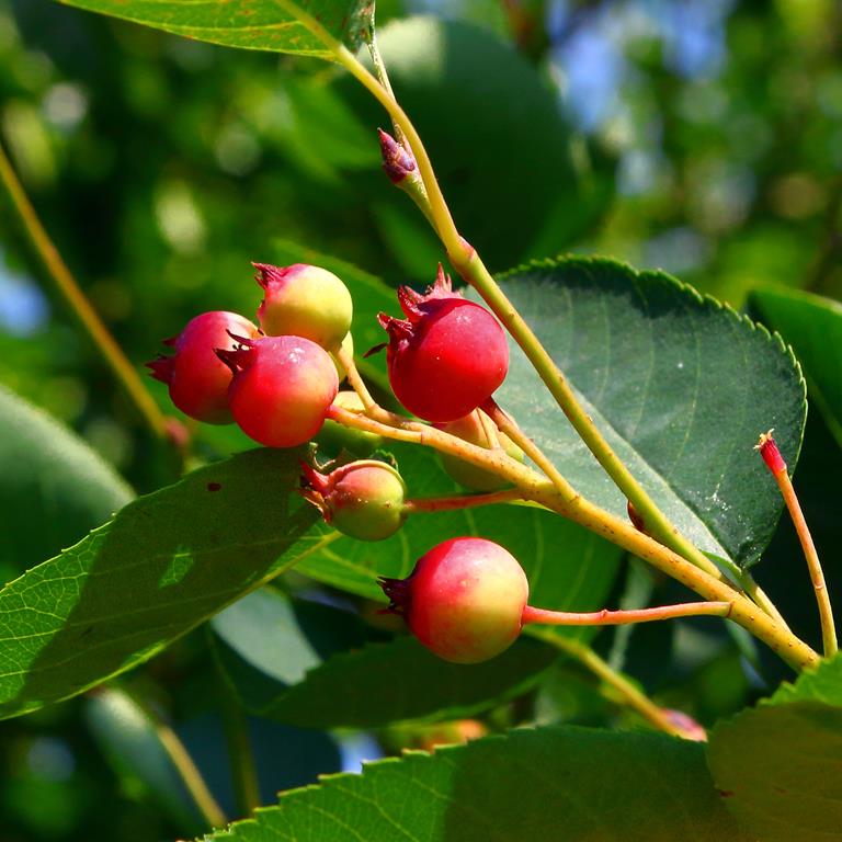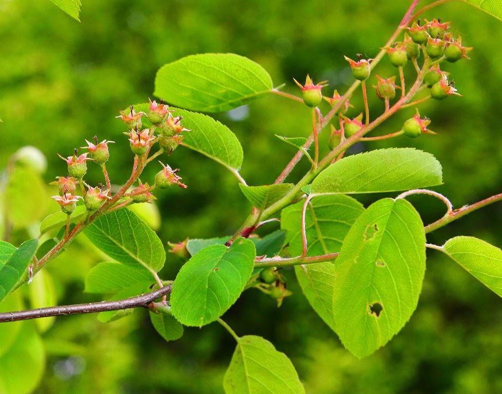 Opis. Krzew dorastający do 4-5 m wysokości o pędach zwykle prosto wzniesionych. Liście eliptyczne, szarozielone. Kwiaty białe, zebrane w krótkie grona. Kwitnie bardzo obficie na przełomie kwietnia i maja. Owoce kuliste, granatowe, jadalne.