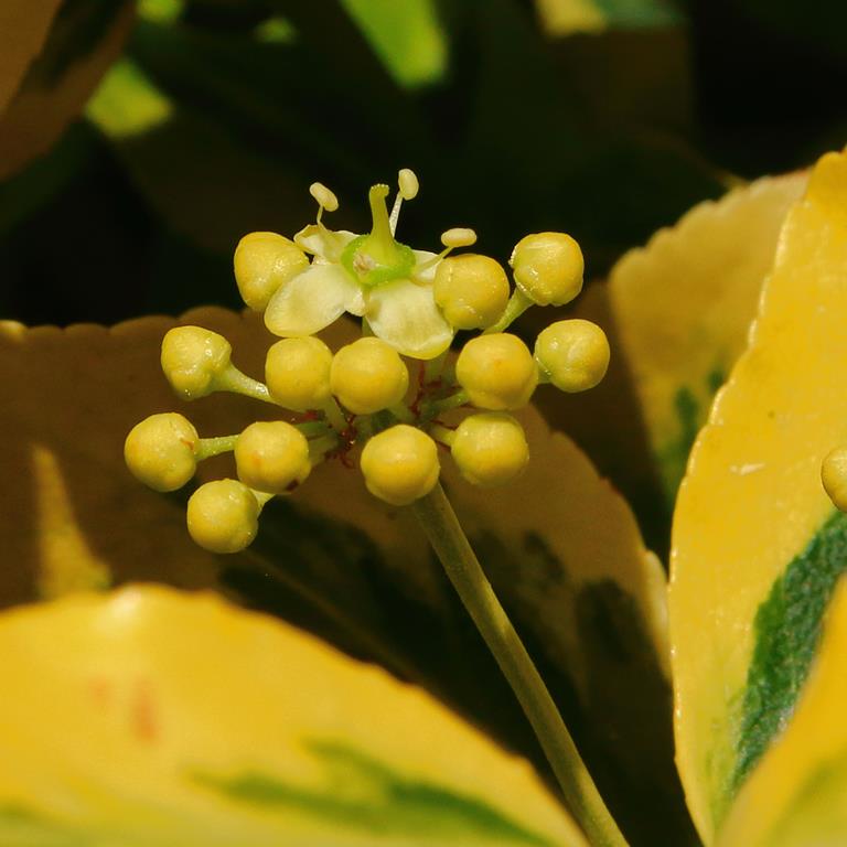 Opis. Wolno rosnący krzew dorastający do wysokości 3-4 m. Pędy zielone, płożące z korzeniami przybyszowymi. Liście zimotrwałe, skórzaste, zielone, z żółtym, nieregularnym marginesem. Wykazuje niewielką skłonność do rewersji (część liści bez przebarwień). Kwiaty zielonkawobiałe, niepozorne, rozwijają się w czerwcu. Owoce drobne, pomarańczowe, liczne, dojrzewają w październiku.