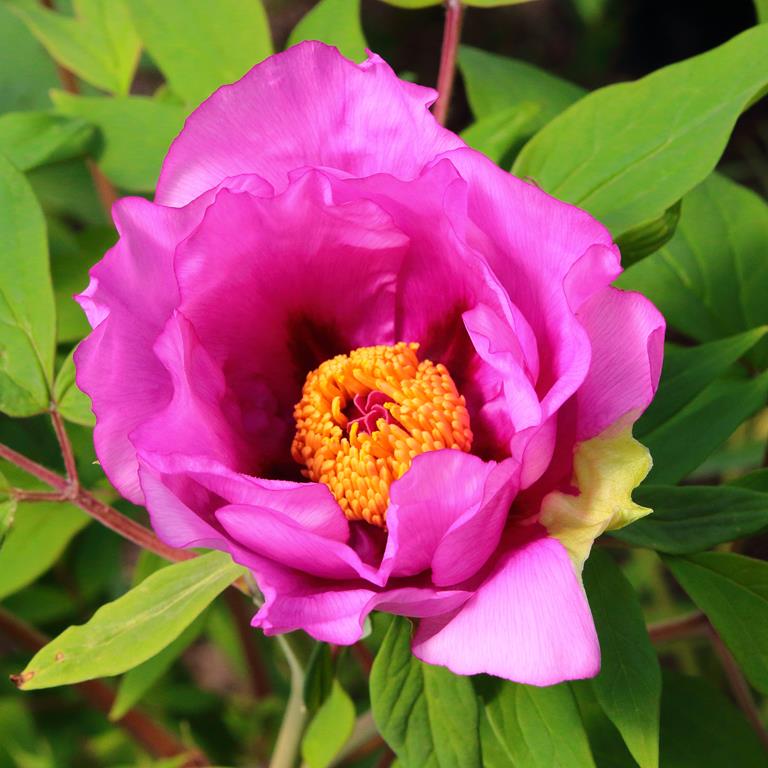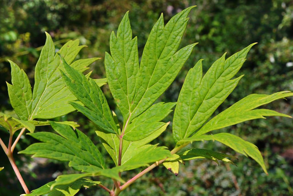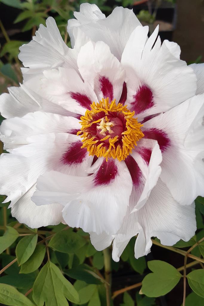 Opis. Długowieczny krzew osiągający do 2,5 m wysokości. Liście duże, ciemnozielone, pierzaste. Kwiaty bardzo duże, pojedyncze, białe, różowe lub czerwone z ciemnofioletowymi plamami u nasady płatków. Kwiaty rozwijają się na szczytach tegorocznych przyrostów w maju. Gatunek znaleziony w 1926 roku przez Josepha Rocka w okolicach klasztoru buddyjskiego Choni w prowincji Gangsu.