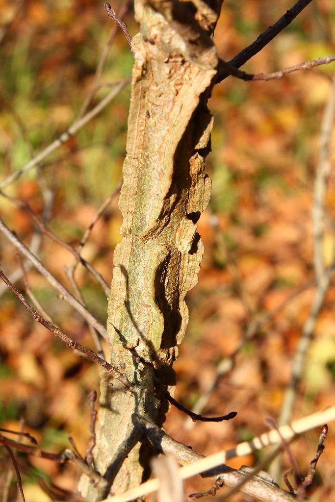 Opis. Drzewo dorastające do około 20 m wysokości. Korona wąska, pędy wzniesione, pokryte grubymi naroślami korkowymi. Kwiaty czerwonawe, małe, wiatropylne, zebrane w gęste pęczki na krótkich szypułkach. Kwitnie na przełomie marca i kwietnia. Owoce w postaci oskrzydlonych orzeszków.
