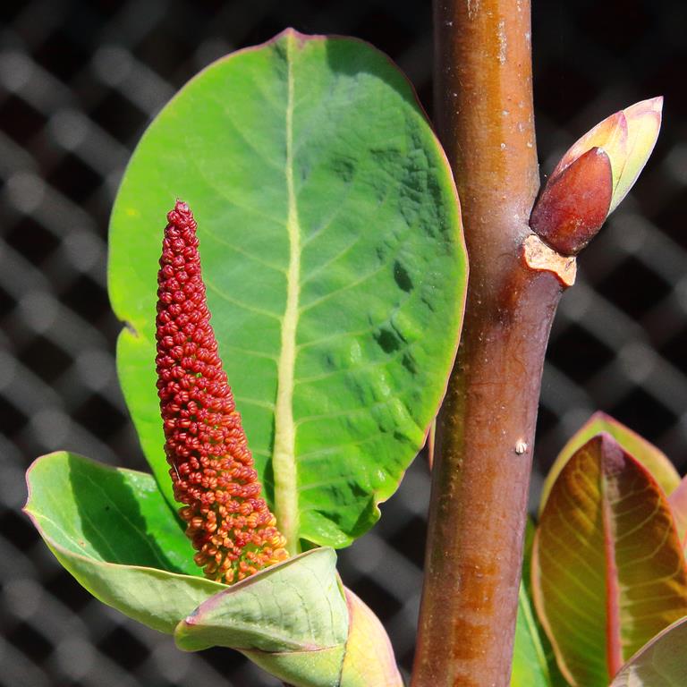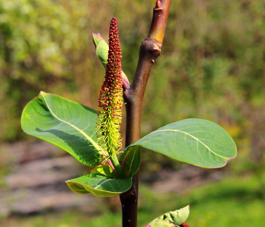 Opis. Krzew dorastający do 3-4 m wysokości. Pokrój wzniesiony, nieregularny, pędy sztywne. Liście bardzo duże, grube, sinozielone. Kwiatostany smukłe, długości do 20 cm, bardzo dekoracyjne.