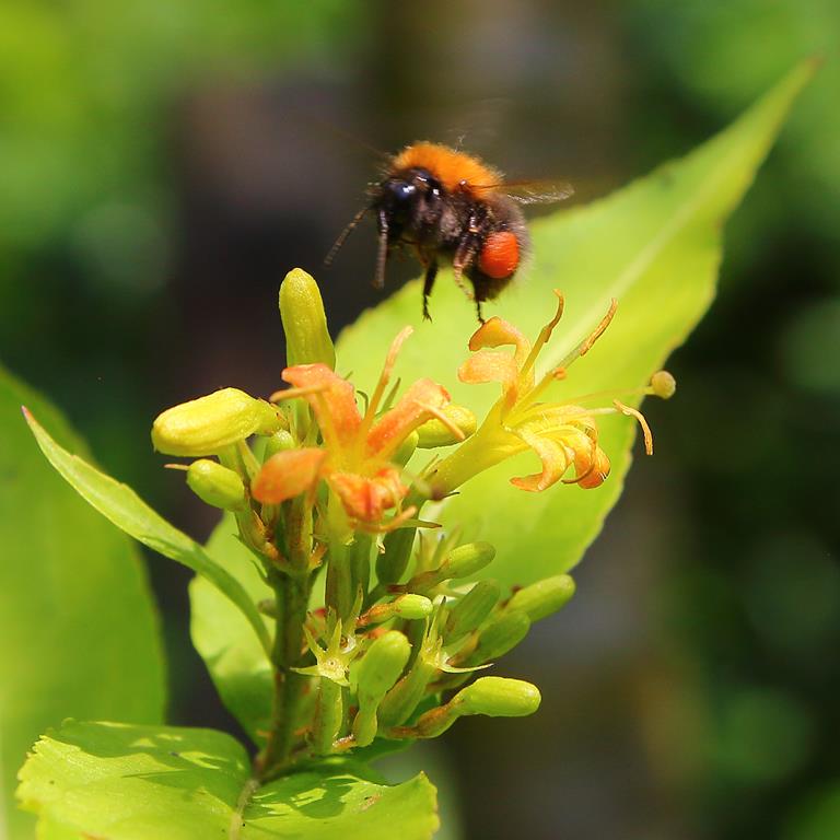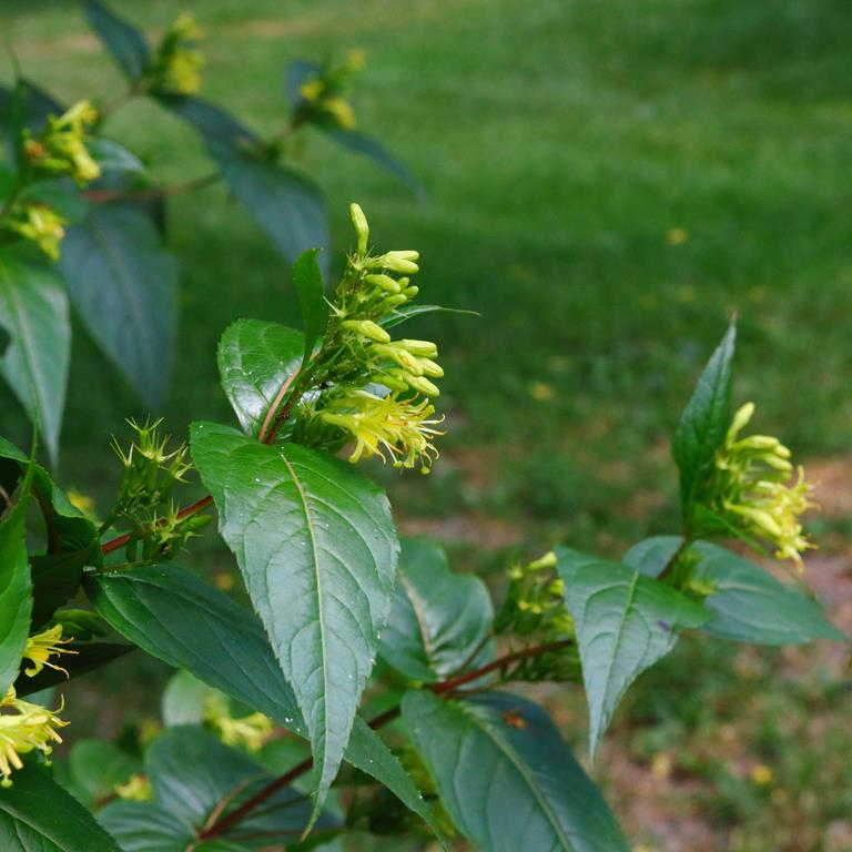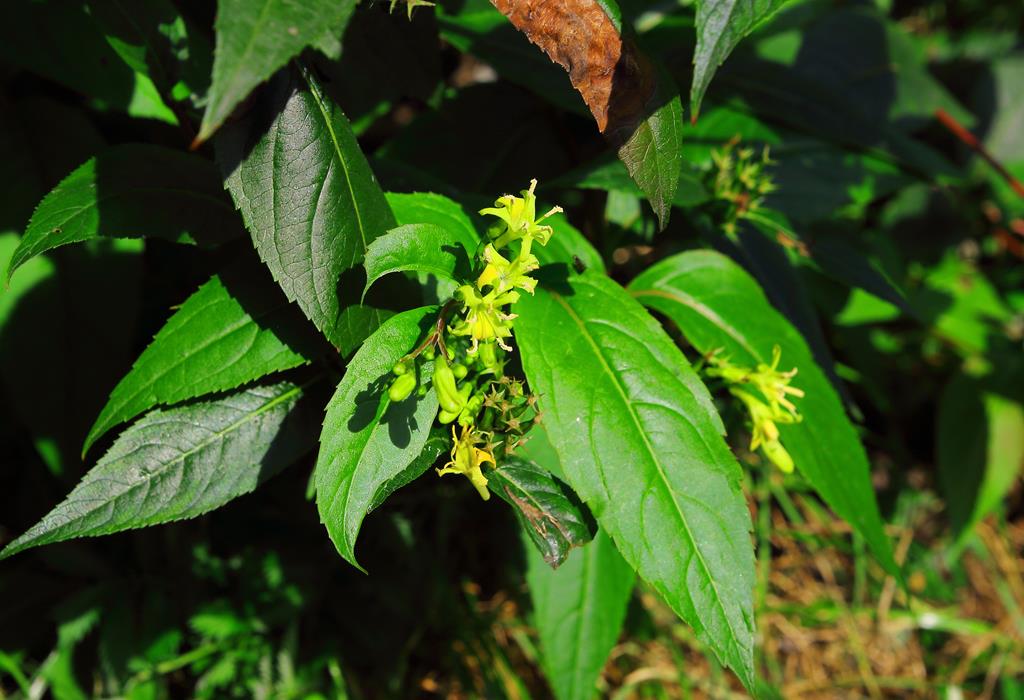 Opis. Niewysoki, zwarty krzew, o pokroju kulistym, dorastający do 1,5 m wysokości. Liście bezogonkowe, ciemnozielone. Kwiaty żółte, dwuwargowe, zebrane w szczytowe kwiatostany. Kwitnie czerwiec-sierpień.