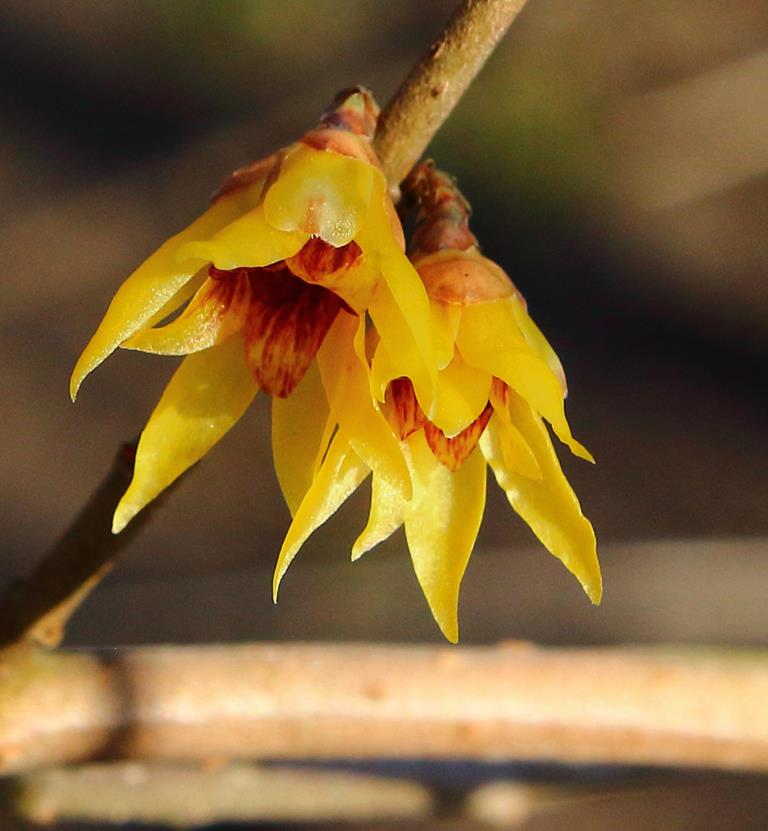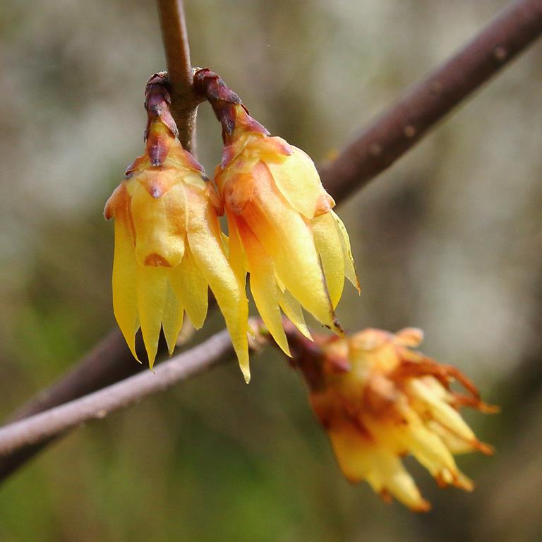 Opis. Krzew dorastający do 3-4 m wysokości. Pokrój wyprostowany, nieregularny. Liście szeroko lancetowate, długości do 20 cm. Kwiaty dzwonkowate, żółte z purpurowobrązowym środkiem, wonne. Pojawiają się na pędach co najmniej dwuletnich w marcu.