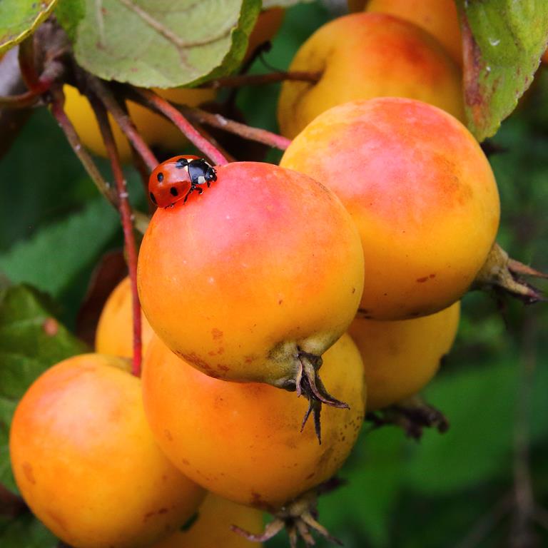 Opis. Niewysokie drzewko o kulistej koronie, osiągające 4-6 m wysokości. Kwitnie bardzo obficie w połowie maja. Owoce bardzo liczne, duże, średnicy 3-4 cm, intensywnie bordowe, bardzo dekoracyjne.