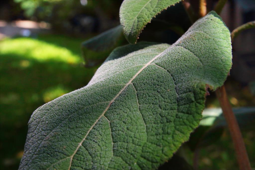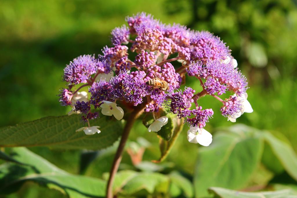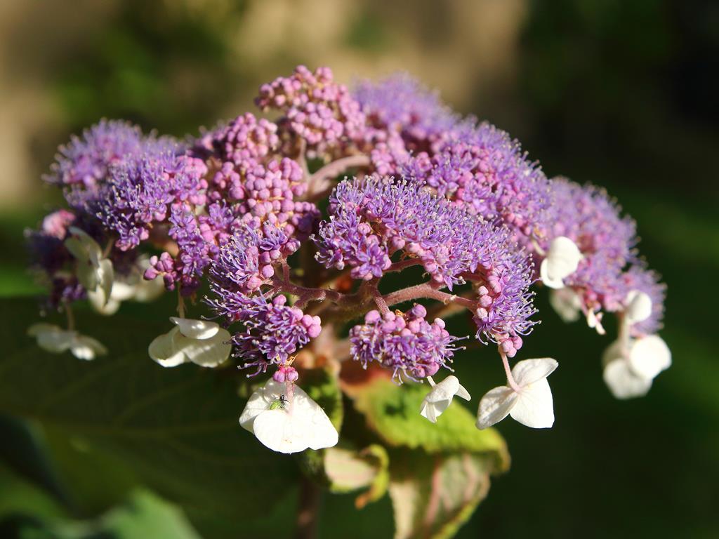Opis: Krzew dorastający 2-3 m wysokości. Pędy grube, sztywne, słabo rozgałęzione. Liście ciemnozielone, eliptyczne, do 30 cm długości, pokryte charakterystycznymi włoskami. Kwiaty płodne drobne, jasnofioletowe zebrane w płaskie kwiatostany otoczone białymi kwiatami płonnymi. Kwitnie w lipcu i sierpniu.
